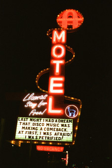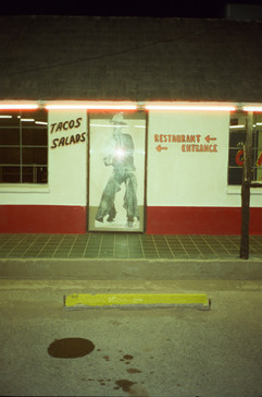 We’re stopped at a gas station outside a small city called Pecos, known for Pecos Bill and for being the home of the world’s first rodeo – the crossroads location on several old cattle and wagon trails brought the most talented cowboys to the area, who eventually competed for the title – if you must know. Craig says to me, “Look over there, people are riding horses in front of all the pylons and machinery.” Grabbing my camera, I walk across the dirt towards them. Through my viewfinder I can see the riders coming over to me… A Cowboy (Angel), along with his daughter (Lyra), tells me to hop over the fence and get on so they can take my photo. On the horse I fumbled, and the photo in question is the one above.